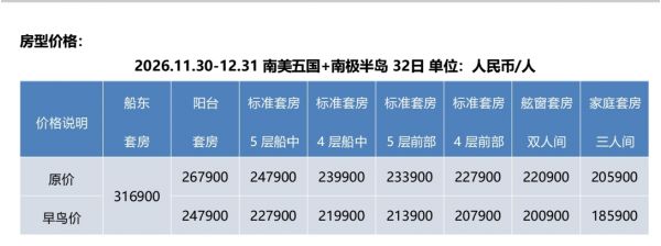 早鳥價: 除船東套房外,其他房型早鳥價立減 2 萬元/人,優惠截止于 2026/2/28備注: 6人起發,10人起派領隊,需自備美簽