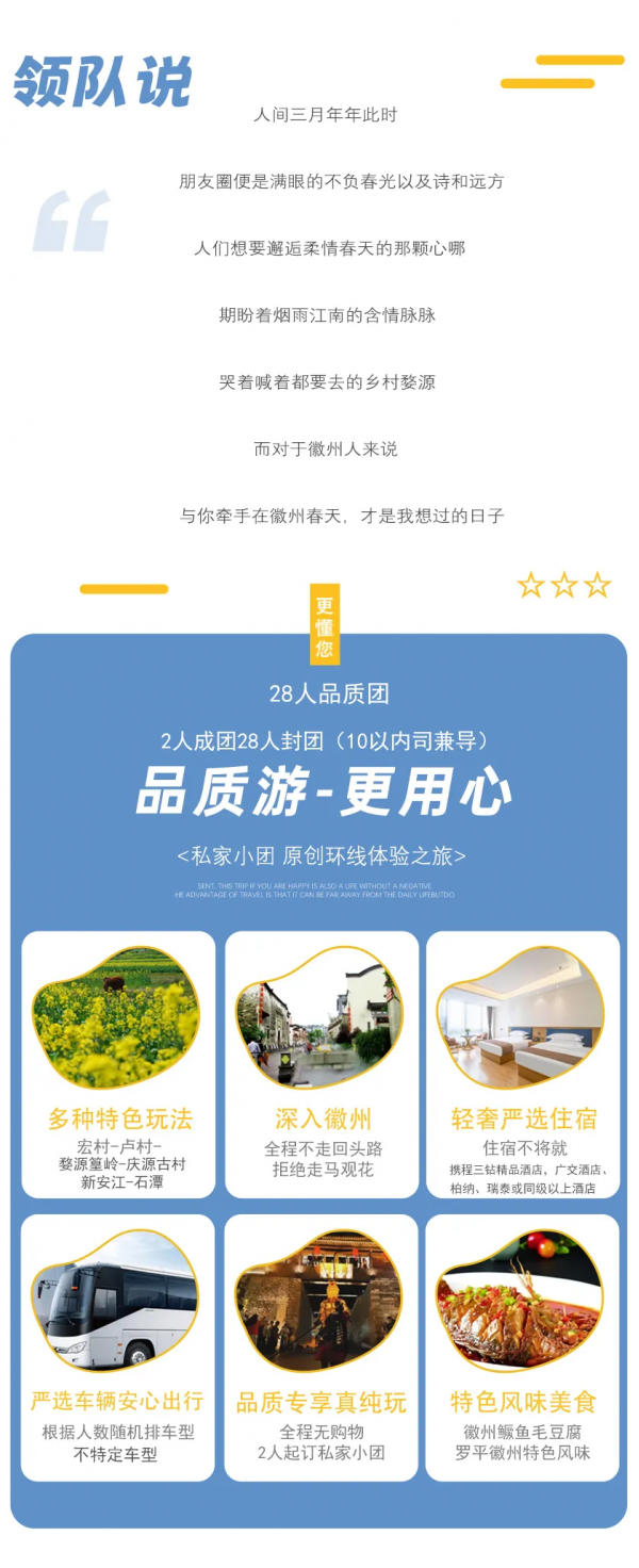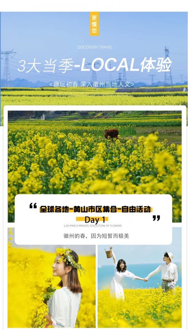 下午徒步蜀源靈山,在養分充足的春天里,漫步花海叢中,感受古老歷史下的小城。約3:00左右結束行程,返程 預計下午16:00抵達黃山市區,建議購買16:30以后或次日返程票。