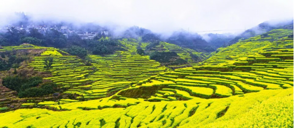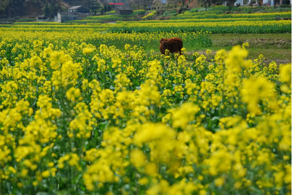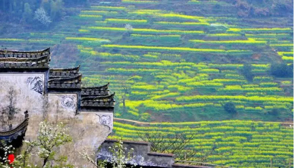 粉墻黛瓦的徽州古民居點綴于廣闊的油菜花叢中