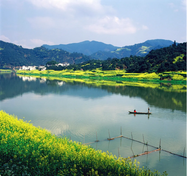 水色甄美,四季澄碧,沿江兩岸,青山蜿蜒,峰巒疊翠。船行在新安江上,兩岸樟桉疊翠,油菜花黃,粉墻黛瓦點綴其間,水墨徽州宛若天成!