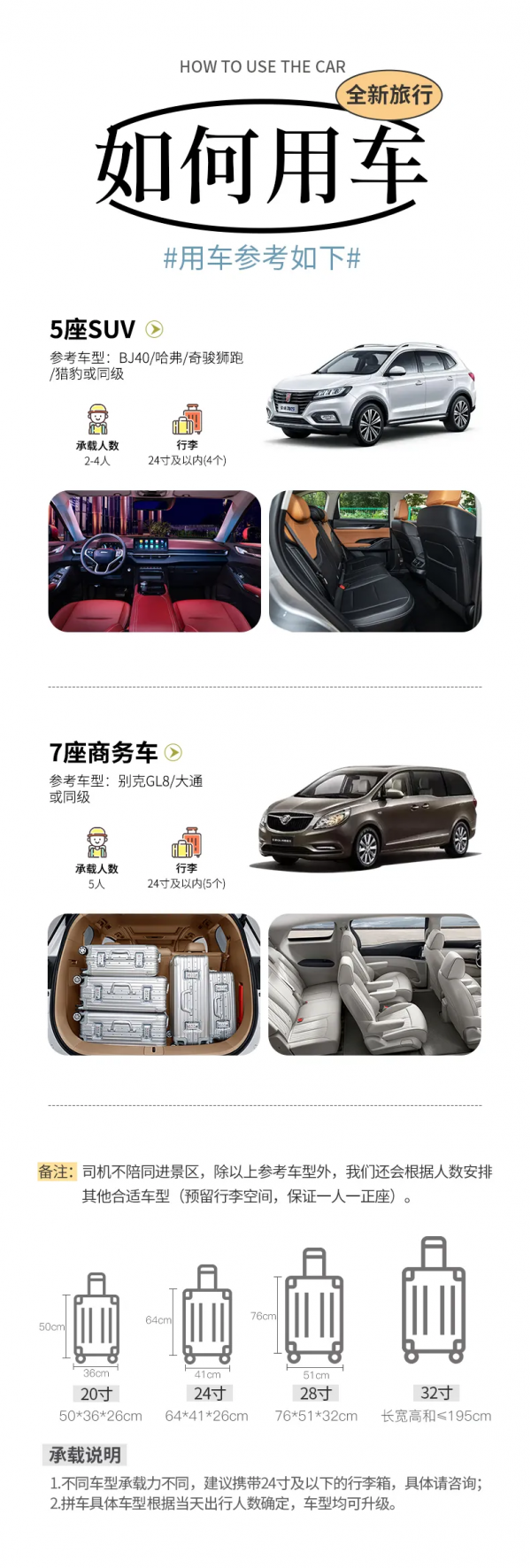 備注:車型承載力有限,攜帶行李為24寸或以下行李箱;
