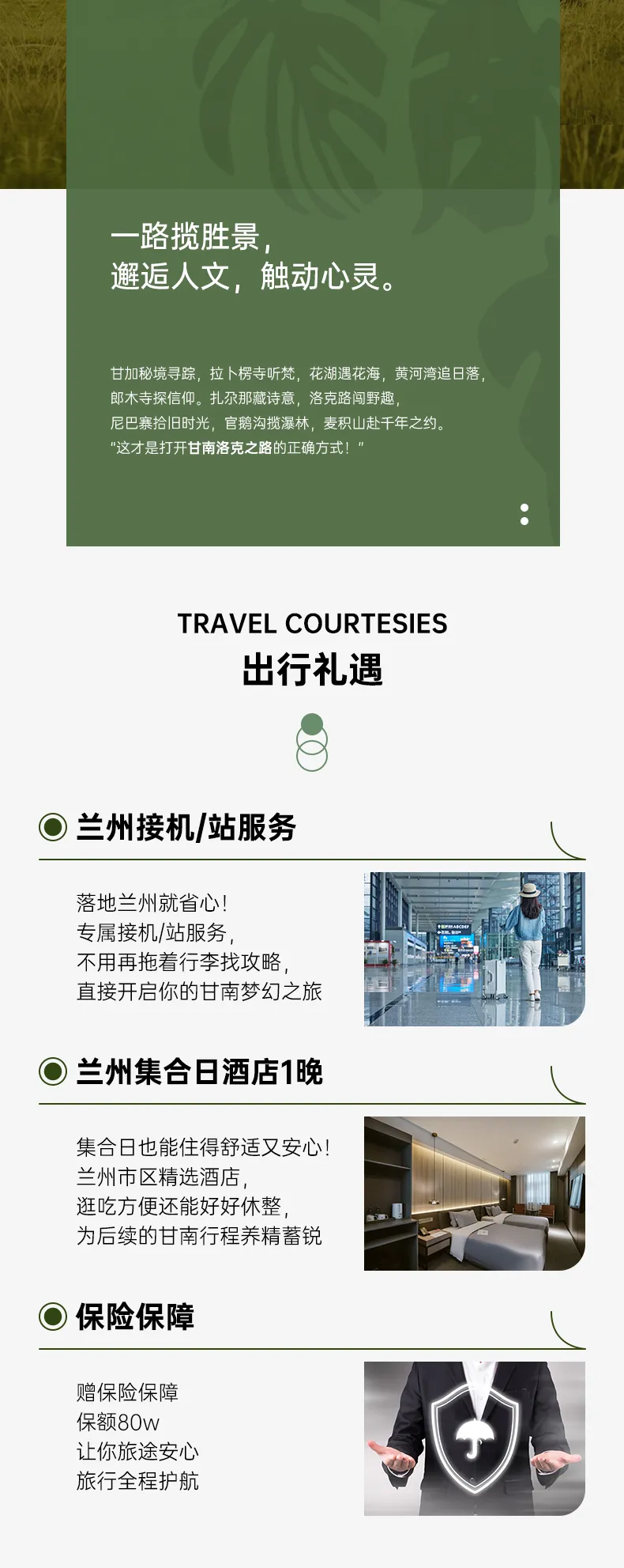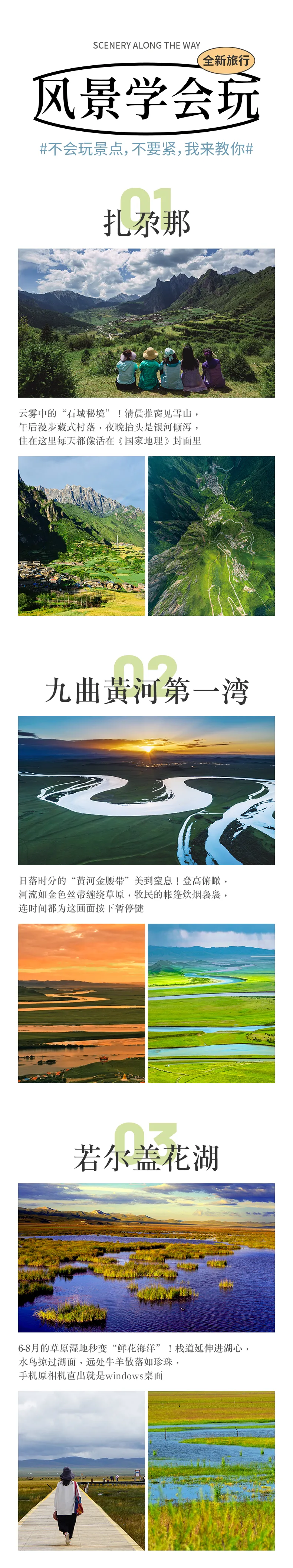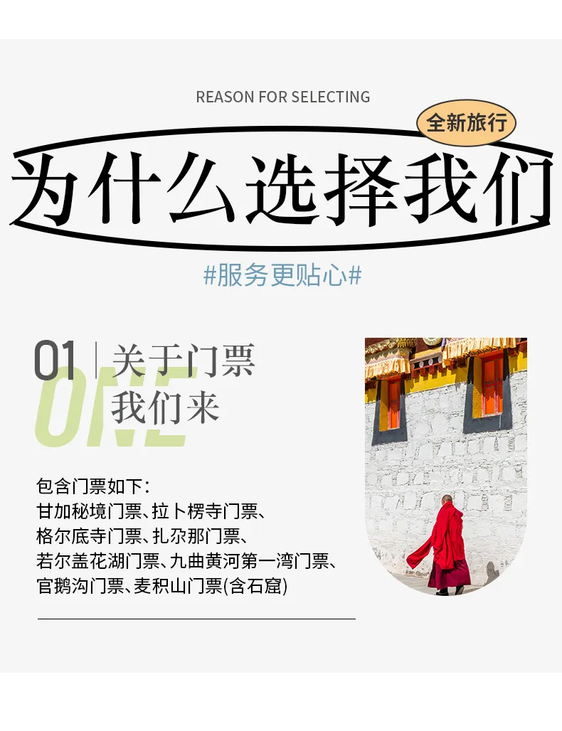 包含甘加秘境門票、拉卜楞寺門票、格爾底寺門票、扎尕那門票、若爾蓋花湖門票、九曲黃河第一灣門票、官鵝溝門票、麥積山門票(含石窟)