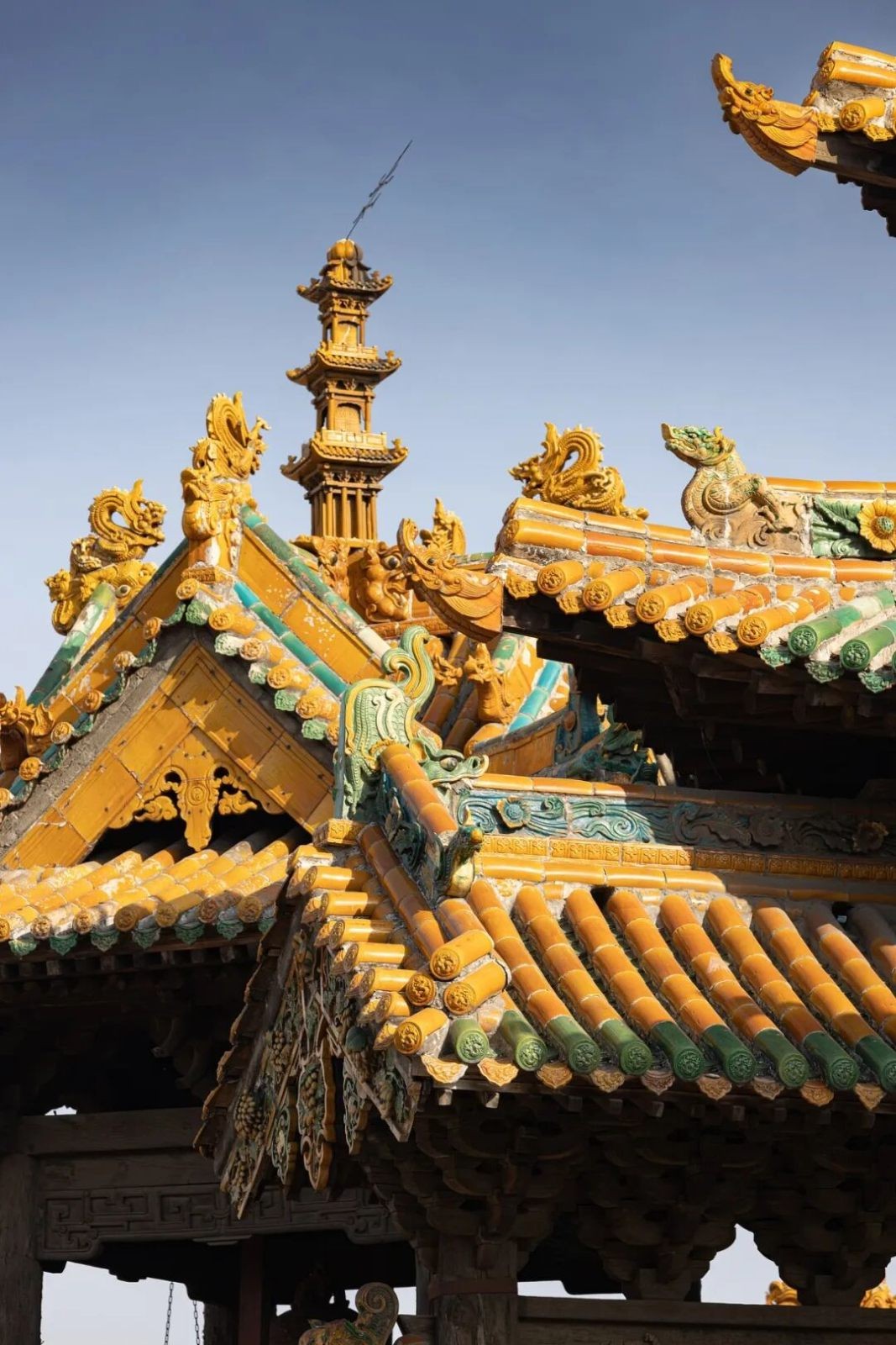 如果想直觀感受這種“屋頂上的藝術”,可以走進后土廟。這座明代建筑被稱為“琉璃藝術瑰寶”,屋脊、殿頂大量使用明黃色琉璃構件,配合千余尊彩塑,視覺沖擊力很強。