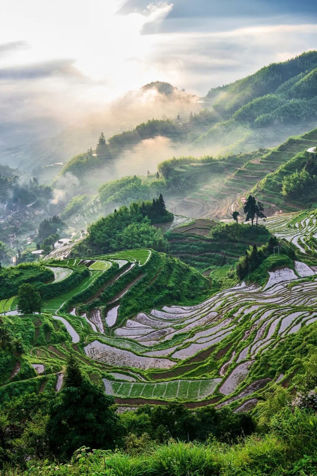 而云和梯田則提供了另一種尺度。作為華東面積最大的梯田群之一,這里的梯田從海拔兩三百米一直延伸到一千多米的山坡上,線條密集而連續。每到春季灌水期,梯田反光明顯,配合山間云霧,很容易形成層層疊疊的山地景觀。