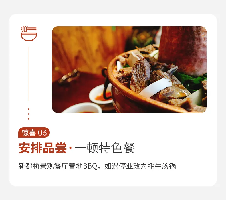 如果時(shí)間充裕,您【成都特色美食】有火鍋、缽缽雞、糖油果子、鐘水餃、龍抄手、紅糖鍋盔、還有各類“蒼蠅館子”,五花八門,色味俱佳,來之前一定要做足功課!成都飲食偏麻、辣,一定注意不要暴飲暴食、吃太辣致腸胃不適