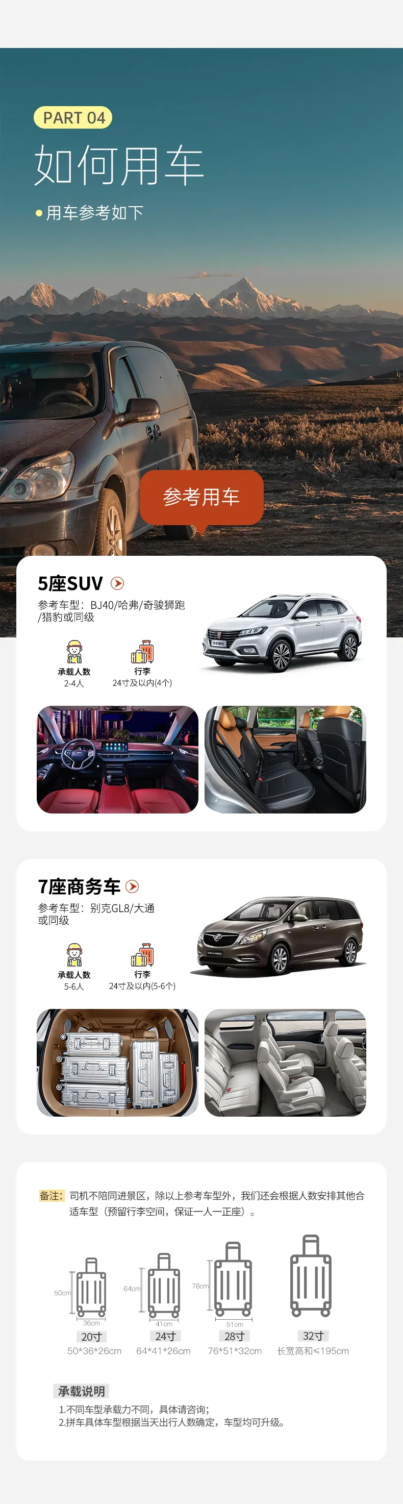 備注:車型承載力有限,攜帶行李為24寸或以下行李箱。