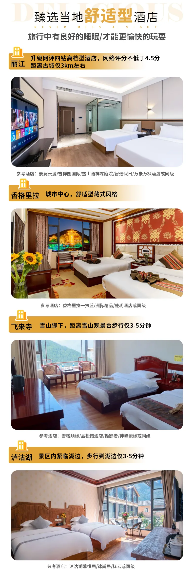 2、住宿:全程5晚優(yōu)選當(dāng)?shù)鼐频辏惤?晚四鉆高檔型酒店,德欽1晚舒適型酒店,香格里拉1晚舒適型酒店,瀘沽湖1晚舒適型酒店);