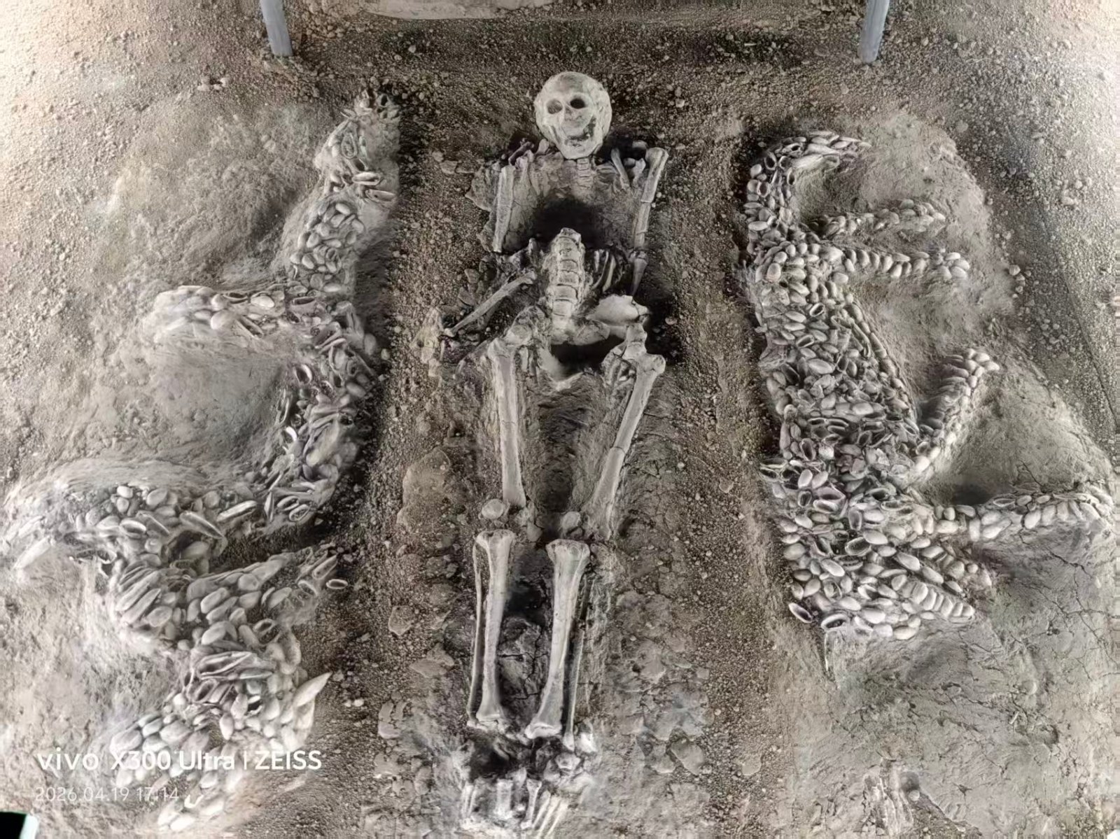 第一組為M45號墓葬,墓主人頭南足北,左虎右龍,腳邊以脛骨與蚌殼組成勺形紋樣。