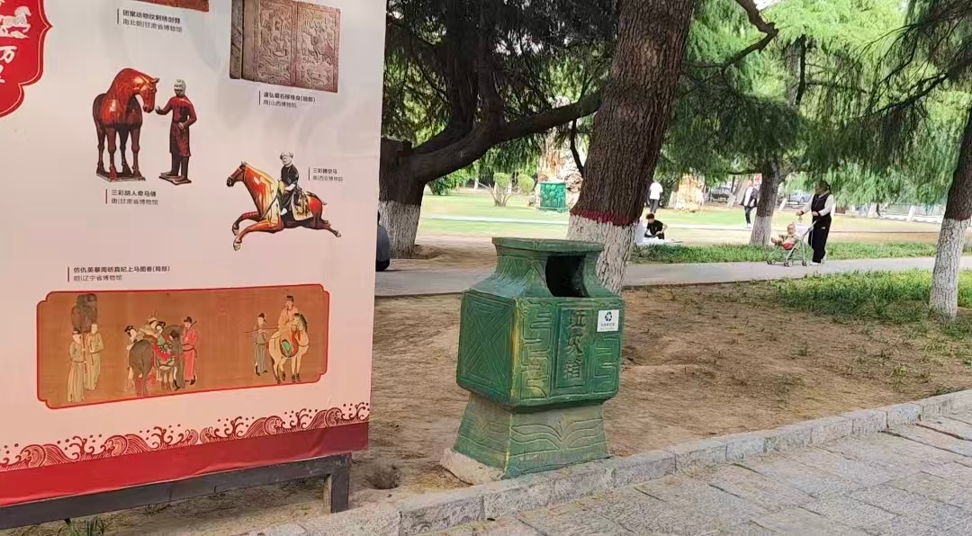 整個園區的細節也很有意思,就連垃圾桶都做成了青銅鼎樣式,仿青銅器造型,古樸又別致,和遺址氛圍融為一體,讓人覺得設計用心又有趣。
