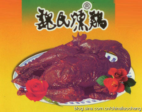 清嘉慶十五年(1810年),聊城魏家扒雞店傳人魏永泰先生創制熏雞,馳名于道光二十年(1840)前后。迄今已有190余年的歷史。當時聊城緊靠運河,交 通 便 利,商 賈 云 集。為 便 于 扒 雞 運 銷 外 地,魏 家 扒 雞 店 研 制 成 這 種能夠長 時期 保存的 熏雞,每 年 農 歷 十 月 至 十 二 月 成 批制作,供全年銷售。魏氏熏雞選料精良,制作精細。選取三斤重的公雞,殺好清凈,內置十六味中藥以及相關的香料,中藥有白芷、草果、枸杞、陳皮、黨參等,香料如八角、桂皮、胡椒、蔥姜等,置煮制的鐵鍋或陶罐中煮爛,中藥及香料皆滲入肉質,再懸起置于火烤煙熏之中。熏制是一個極慢的過程,先是炭烤,后為煙熏,用比較純的木質鋸末置熱鐵板上引煙。三斤重的大公雞熏至一斤左右,褐色如鐵,恰是一毛不存的鐵公雞了。1935年夏,老舍先生為之名曰“鐵公雞”。經熏制的扒雞,水分少、皮縮裂、肉外露、無彈性、藥香濃,可存一年左右不變質。這種熏雞,形美肉嫩骨酥,色鮮味美,肉質梗韌,香而不膩,入口余香深長獨特。食用方便。撕開即可食,入口余香深長獨特,既可下酒,又可佐茶。魏氏熏雞是一道嚼菜,十分的具有韌性。咀嚼魏氏熏雞,漸漸的香味在兩舌邊滲出,舌后端便也就感知淡淡的煙火氣息,堪稱上等美肴和饋贈佳品。魏氏熏雞制作技術,代代相傳。魏氏子孫仍嚴格按照傳統工藝,并吸收先進技術,采用新的設備制作熏雞,產量、質量均不斷提高,產品遠銷閩、粵、浙滬、京、津等地。