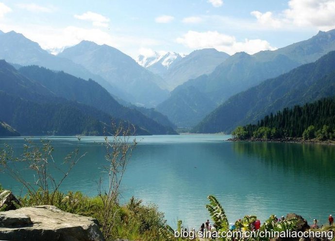 草甸如菌,山花鮮艷。風靜波平時湖水似一池翡翠,隨著天氣的變化又更換著不同的色調,自晨至夜換變著風采。每當云霧繚繞,雪峰、春山若隱若現,恍若隔世。七八月份雨后清晨登上