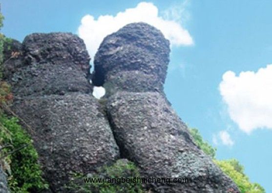 在羅漫山大石牌北端有一尊直徑約一丈,高約五丈的大石柱,它凸出石崖之外,下部同石崖連在一起,上部有分有合。從南邊看猶如一對年輕的情侶在接吻,從北邊看猶如兩位老人在接吻,所以人們稱之為接吻石,人們認為是神仙下凡變成的, 版權(quán)所有山東聊城聊之旅國際旅行社有限公司,轉(zhuǎn)載必究!是世界上獨一無二的奇特景觀,它同中國古代有關(guān) “伏曦兄妹造人民”的神話故事有關(guān),所以人們稱之為天下第一吻或仙人接吻。人們說接吻石是忠貞不渝的愛情楷模,它在演繹著千百萬年流傳下來的愛情故事,人們看到它都會有所感觸,特別是熱戀中的情侶必會熱血沸騰、情感升華……讓天下有情人為之動容!