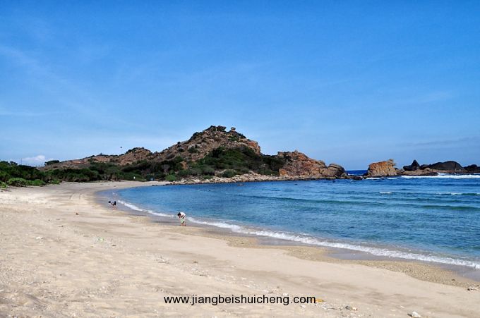 牛車灣位于三亞市東面30公里處,在海棠灣與亞龍灣之間,與蜈支洲島相對望,從海上觀牛車灣,右邊的小山與礁石如車轅,對應著前面如老牛一樣的蜈支洲島,整個形狀如鄉下老農的牛車,由此稱為牛車灣。