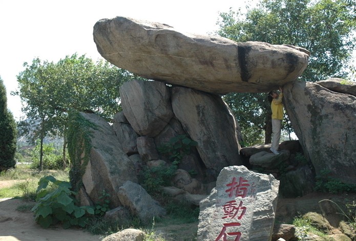 指動(dòng)石旅游風(fēng)景區(qū)依山傍水,山間巨石林立,其間最著名的便是那塊一指可動(dòng)的百?lài)嵠媸耍L(zhǎng)7米,寬5米,重達(dá)百?lài)崳绱她嬋淮笪铮瑓s可憑游人一指之力,上下顫動(dòng)。面對(duì)如此奇觀,攝影家們也紛紛走上前去,感受百?lài)嵕奘谧约旱氖种赶挛⑽㈩潉?dòng)的奇妙感覺(jué)。指動(dòng)石還有另一奇特之處,那便是在它的底部有一幅中國(guó)地圖,大西北、東三省、寶島臺(tái)灣都?xì)v歷在目,于是指動(dòng)石便有了另一個(gè)豪邁的名字——“指點(diǎn)江山”。
