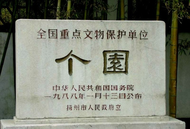 中國四大名園之一(北京頤和園、承德避暑山莊、蘇州拙政園),建于清嘉慶年間,是當時兩淮鹽業商總黃至筠的私人園林。園內多種竹,園主人又特別愛竹,認為竹本固、心虛、體直、節貞,有君子之風。竹葉形狀類似“個”字,故取名“個園”。