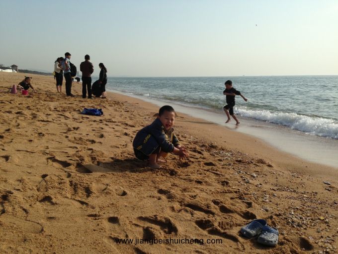 你看那個小男孩兒,被海浪打上來了吧,還是老實點(diǎn)兒玩沙子吧