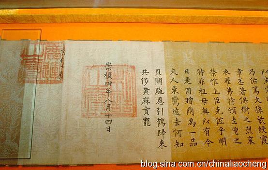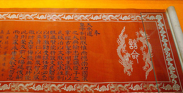 博物館館長劉新華先生介紹,這處“圣旨”博物館為二層仿古建筑,展出面積1000多平方米,館藏明代、清代的詔書、國書、誥封、敕封(通稱為圣旨) 達132道之多,開館展出的“圣旨”55道,以及“偽滿洲國圣旨”和日本、越南、韓國等國家的“圣旨”,并配以明清時期的科舉試題、殿試卷、官場文書、字畫匾牌及用墨魚汁做墨汁密寫在衣衫內的“夾帶小抄”等科舉文物2000多件,反映了當時的政治、經濟、軍事、外交及中國宮廷文化等多種形態。
