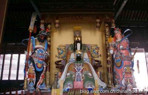 進入大殿,便可以看到三尊神像。原有的神像在解放前毀于戰火,現在的神像是1990年還原復制而成的泥塑像。中間是頭戴十二硫冕,手捧鎮圭,身穿龍袍的關圣帝君,兩側分別為周倉和關平。關羽生前以忠義聞名,被封為漢壽亭侯漢前將軍。死后被追封為“壯繆”侯。后來的各朝各代的皇帝希望人們學習他的忠義為自己的封建統治王權服務,所以對關公的封號也是非常多的。有對聯寫得好“漢封侯,宋封王,明封大帝;儒稱圣,釋稱佛,道稱天尊”。從中我們不難了解,各代王朝、儒、釋、道三界對關羽的推崇到了何等高度。所以,這兒關公神像的皇帝打扮是有歷史依據的,同時也表現了山陜商人對他的崇拜之情。另外,在我們印象中,關羽是臥蠶眉、丹鳳眼、面如重棗的美髯公,眼前的神像卻為什么是黃臉的呢?這里呢,有一個傳說故事。