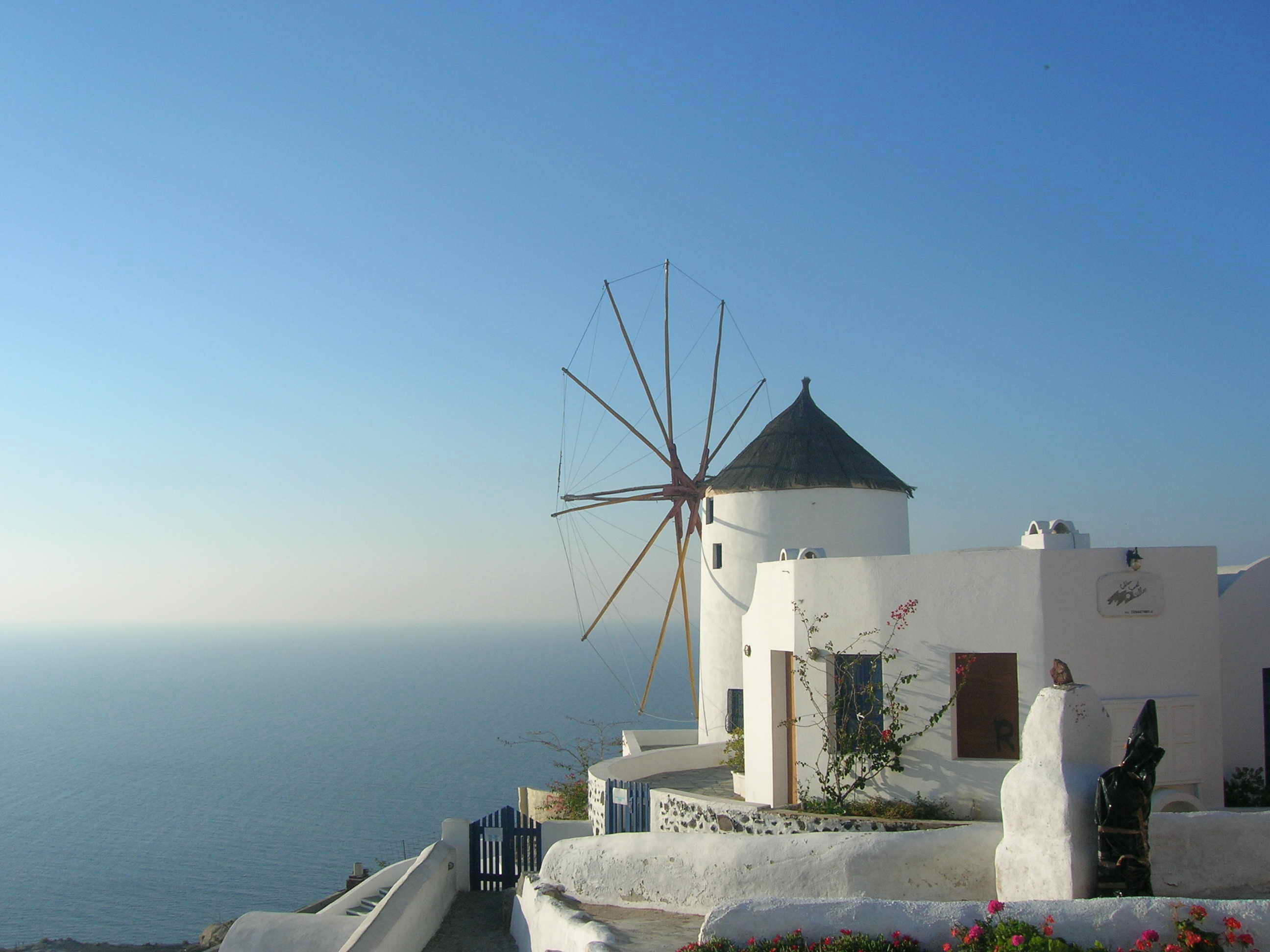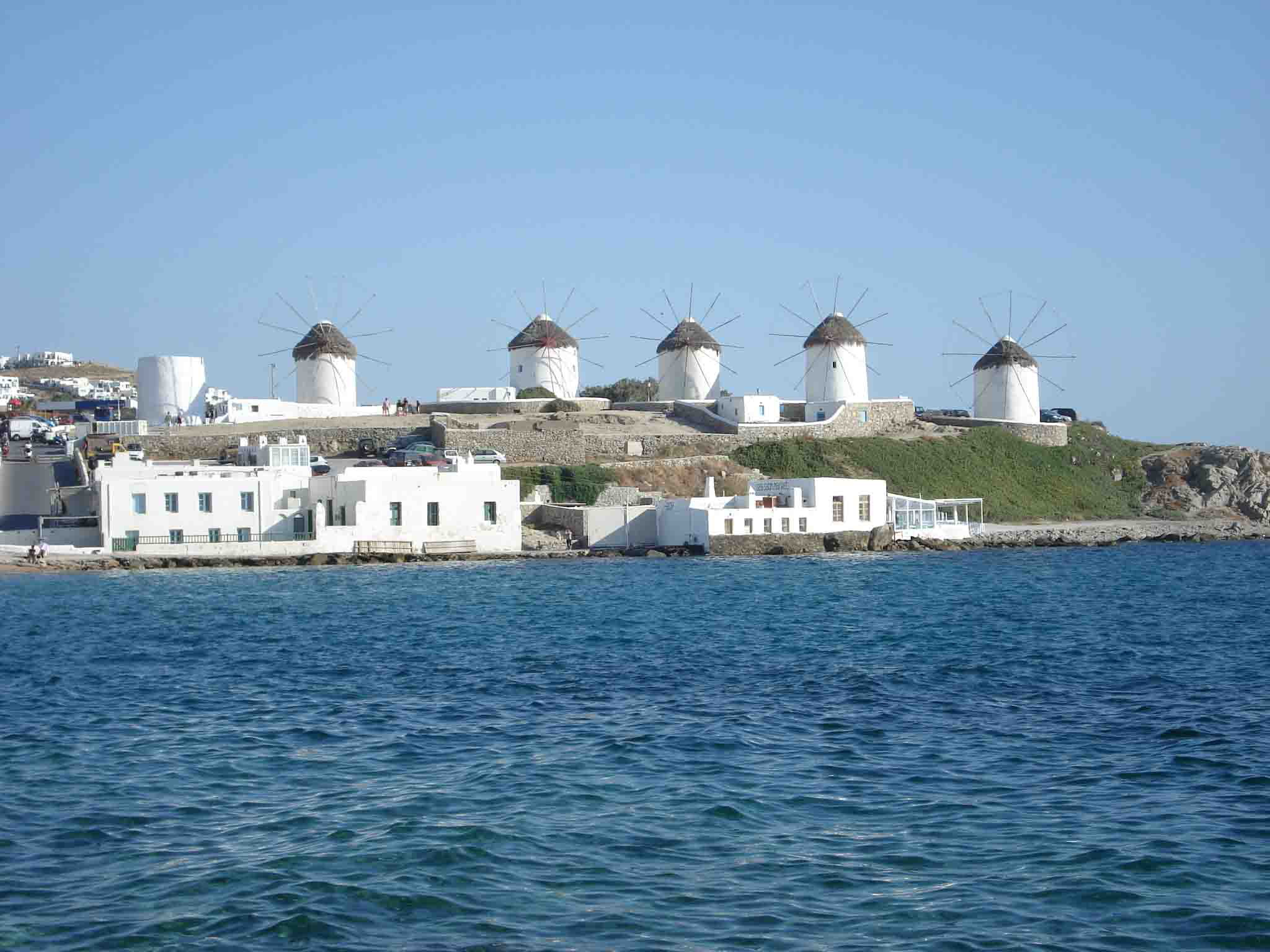 米克諾斯島是希臘南部基克拉澤群島中的一座,也是愛琴海上最享盛名的度假島嶼之一。島上居民很少,每年大約半年的非旅游時間,島上相當安靜。四月以后,旅游季節(jié)開始了,來自世界各地的游客就像候鳥一樣絡繹不絕地飛來島上,享受地中海的陽光和海灘。在島上漫步,看到房頂都是用大石塊壘起的平頂,覺得很奇怪。問了當地的居民后才知道,島上冬天寒冷,風特別大,只有這些結實的屋頂才能抵御寒風。在島西南面海邊的小山丘上,有5座基克拉澤式的風車,這是米克諾斯島的標志。