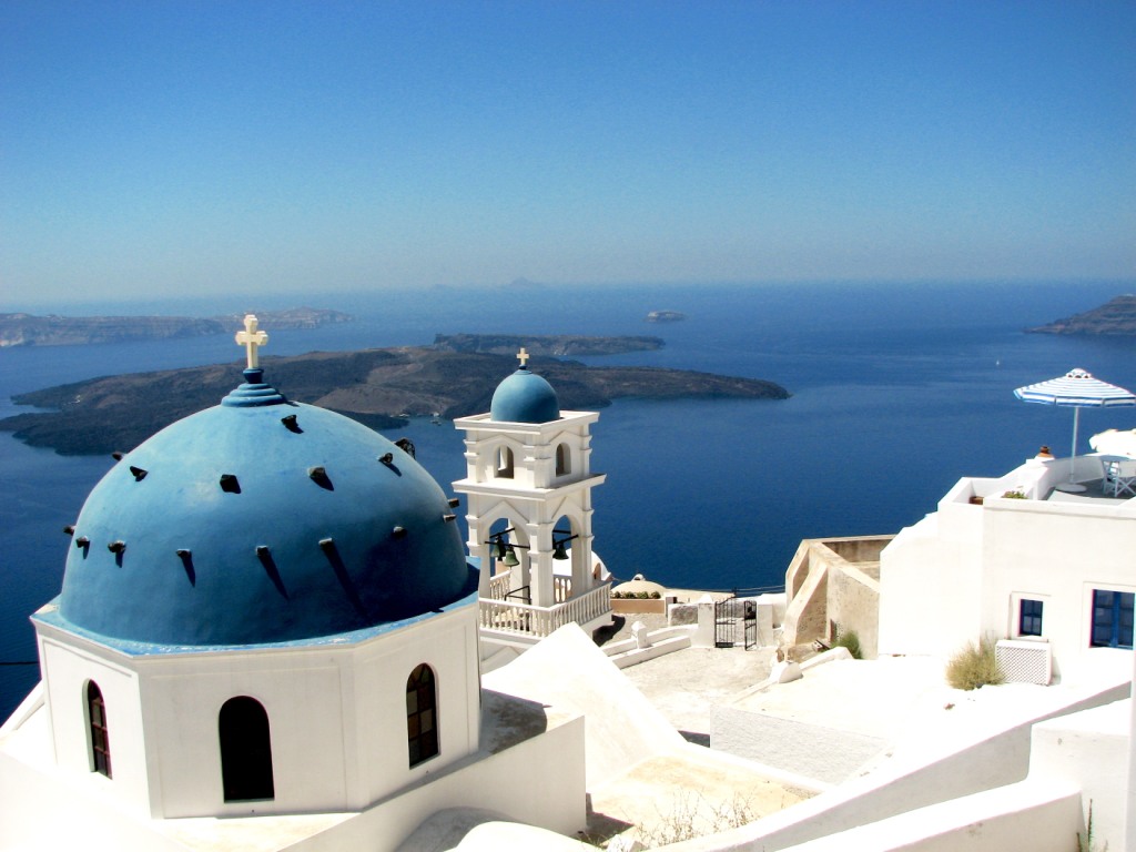 從米克諾斯島乘船到圣特里尼島約需5小時航程。來到以后,才知道很多觀光手冊和旅行社都把米克諾斯島和圣特里尼島作為推薦給游客的首選,是不無道理的。我們的油輪剛靠岸,大家就驚奇地發(fā)覺,海邊陡峭的山崖呈紅褐色,山崖的頂端是一片白色的房屋,小巧明麗。據說,該島位于世界兩大大陸板塊最深的海溝之間,原來是圓形的。3500年之前的一次火山爆發(fā),島嶼被震出一個大洞,一大塊月牙形的就成了主島,周圍還有幾個小島,其中一個小島納亞卡美尼至今還是活火山。