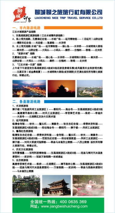 電話:0635-8333000 8336000 8339000 傳真:0635-8336665 地址:山東省聊城市東昌府區(qū)興華東路7號(hào) 郵編:252000 官方網(wǎng)站:www.chun-gong.com.cn 歡迎致電全國統(tǒng)一(免長途)熱線:400 0635 369 國內(nèi)旅游請按1 國際旅游請按2 聊城旅游請按3 票務(wù)會(huì)議租車請按4 人工請按0 版權(quán)所有:Copyright(C) 劉寶平工作室_Mr.Liu Stu 聊城市旅游攝影協(xié)會(huì) 「我們」? 商會(huì)丨俱樂部丨實(shí)業(yè)公司 山東聊城聊之旅國際旅行社有限公司