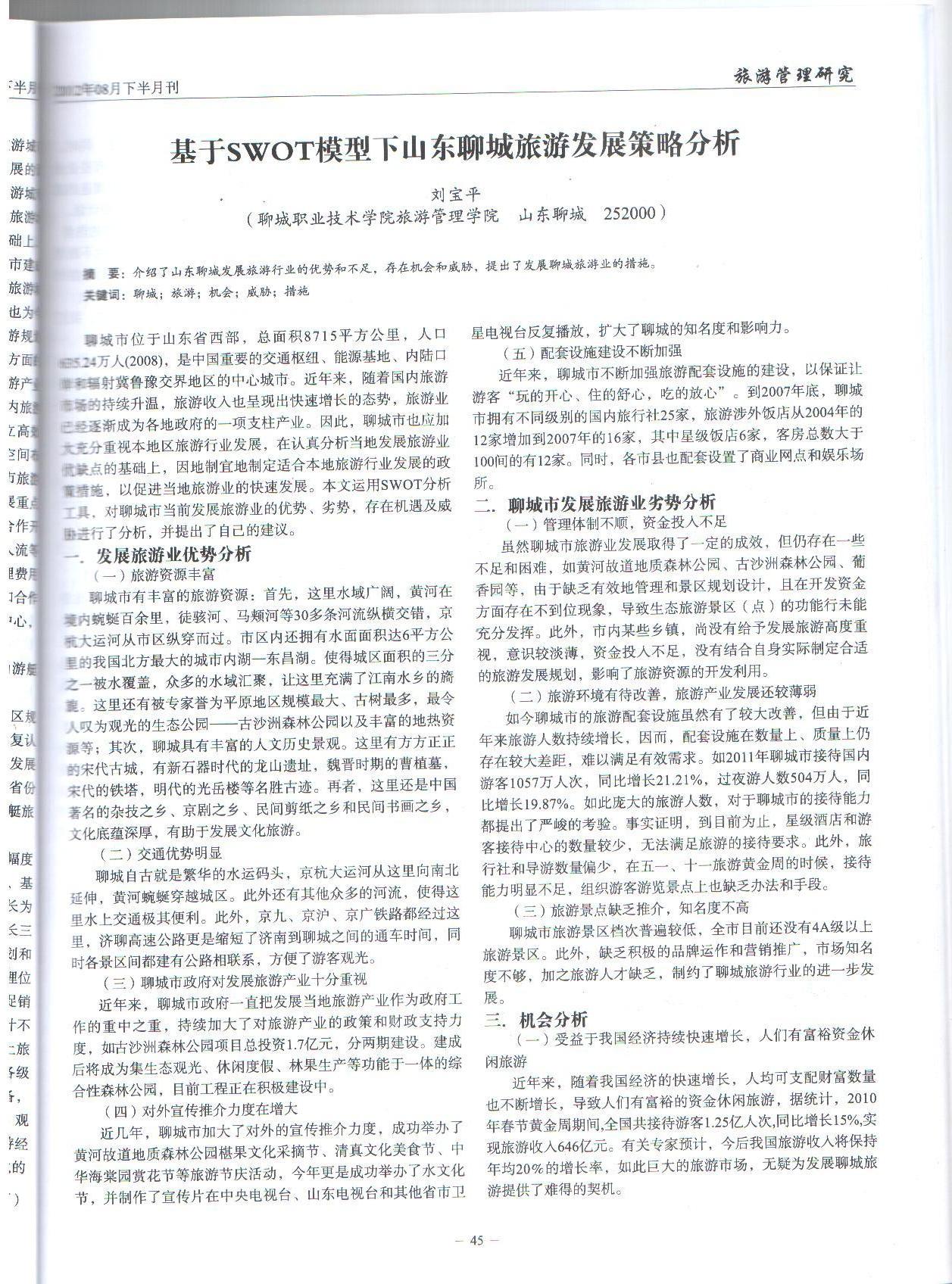 《旅游縱覽》(國家級)發表劉寶平文章《基于SWOT模型下山東聊城旅游發展策略分析》刊登在2012年8月版。