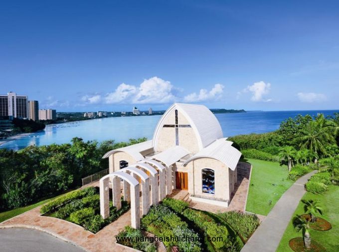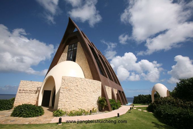 有近2000粒大小不同的施華洛世奇水晶從天花板垂下來,在陽光長年普照的關(guān)島,加上海水的折射,令教堂內(nèi)不斷閃耀著不同的顏色。全白色的墻加上藍(lán)白色的玻璃窗,整個(gè)教堂就像一座水晶宮。