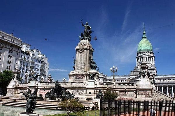 大廈前屹立著氣勢宏偉,造型別致精美的兩會(huì)紀(jì)念碑。紀(jì)念碑底座是一個(gè)寬闊的花崗巖平臺,四個(gè)角上雄踞著展翅欲飛的銅塑雄鷹,紀(jì)念碑頂上站立著一尊代表共和國的婦女銅像,她右手持象征勝利的月桂枝,左手扶犁代表勞動(dòng),腳下踏著一條毒蛇,表示懲戒邪惡。版權(quán)所有山東聊城聊之旅國際旅行社有限公司,轉(zhuǎn)載必究!紀(jì)念碑的中部兩側(cè),各有一個(gè)婦女雕像,一個(gè)高舉掙斷了的鐵鏈,象征1813年大會(huì),另一手拿國旗、國徽,象征1816年議會(huì)。緊靠紀(jì)念碑底座前邊有一座音樂噴泉?;◢弾r的水池周圍,有一組生動(dòng)的銅雕。一個(gè)男青年腰圍飄逸的布裙,象征著奔流的拉普拉塔河水,他身邊兩位捧罐倒水的婦女則代表拉普拉塔河的兩個(gè)支流,在他們前面有四匹駿馬好似從水中騰躍而起,馬口也是噴泉的出水口,此外還有造型逼真的蜥蜴、水蛇等拉普拉塔河流域的動(dòng)物。音樂聲起,水柱騰空,隨著節(jié)拍搖弋起舞。夜晚配以變幻的燈光,場面更加迷人。