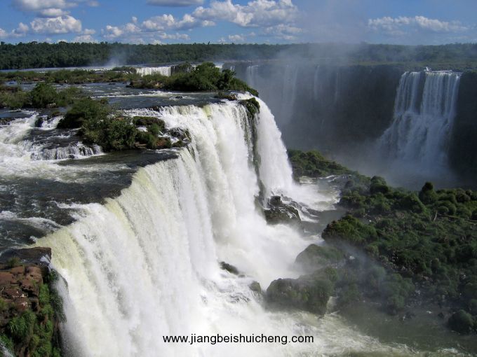 伊瓜蘇大瀑布,亦作Iguassu或Iguazu,西班牙語作Cataratas del Iguazu,葡萄牙語作Cataratas do Igua?u或Saltos do Igua?u,平均流量1,751立方米/秒,為馬蹄形瀑布,高82米(269呎),寬4公里(2.5哩),是北美洲尼加拉瀑布寬度的4倍,比非洲的維多利亞瀑布大一些。懸崖邊有無數樹木叢生的巖石島嶼,使伊瓜蘇河由此跌落時約分為275股急流或瀉瀑,高度60~82米(200~269呎)不等。該瀑布與伊瓜蘇河皆得名于一個意為「大水」的瓜拉尼語(Guarani) 詞匯。流入伊瓜蘇河。
