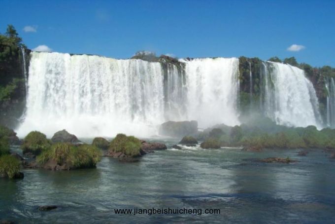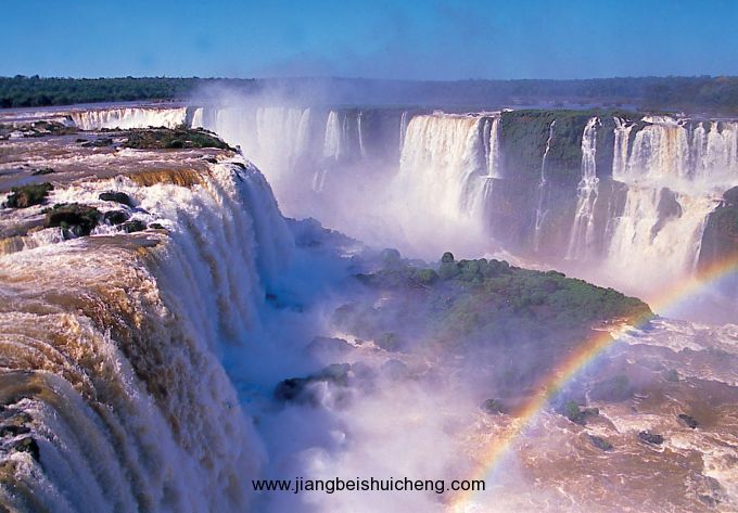 伊瓜蘇大瀑布在伊瓜蘇河上,沿途集納了大小河流30條之多,到了大瀑布前方,已是一條大江河了。伊瓜蘇河奔流千里來到兩國邊界處,從玄武巖崖壁陡落到巴拉那河峽谷時,在總寬約4000米的河面上,河水被斷層處的巖石和茂密的樹木分隔為275股大大小小的瀑布,跌落成平均落差為72米的瀑布群。由于河水的水量極大,在這里匯成了一道氣勢磅礴的世界最寬的大瀑布,其水流量達到了1700立方米/秒.這一道人間奇景,在30公里外就能聽到它的飛瀑聲。