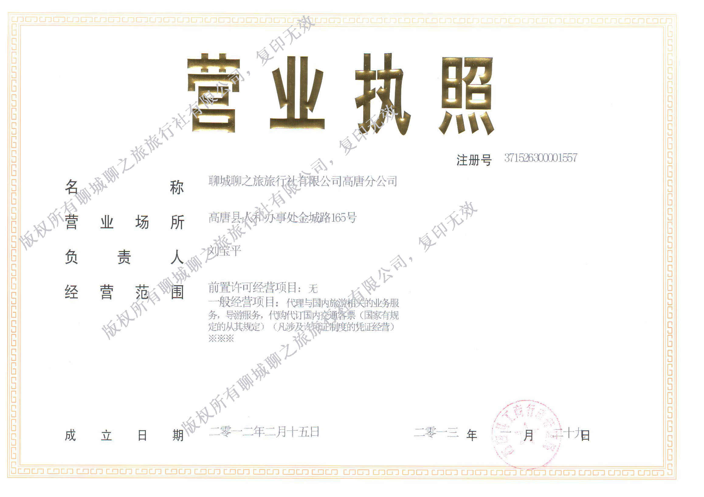 自2013年1月23日起,聊城聊之旅旅行社有限公司高唐分公司為總公司全資子公司。地址搬遷至:高唐縣金城路165號(新華書店西側)。特此公告!