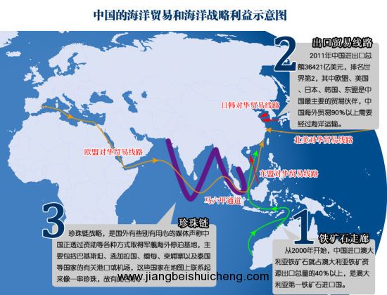 三是打通中國通往印度洋的陸上戰略通道。中國應力求控制進出印度洋的各個咽喉要地。中國海軍謀求控制從蘇伊士運河到霉爾木茲海峽再 到馬六甲海峽等印度洋水域咽喉要道的能力。中國不是瀕臨印度洋的國家,只能繞道南中國海通過馬六甲海峽進入印度洋,或者借助周邊國家建立陸上通道抵達印度洋。目前,中國與印度洋之間的主要通道仍是南中國海-馬六甲海峽,中國進口原油的80%和商品貿易的70%都是通過這條路線。但這條海上通道不僅路途遙遠,而且風險巨大,中間有臺灣海峽,以及菲律賓、越南、澳大利亞、新加坡的美國軍事基地。