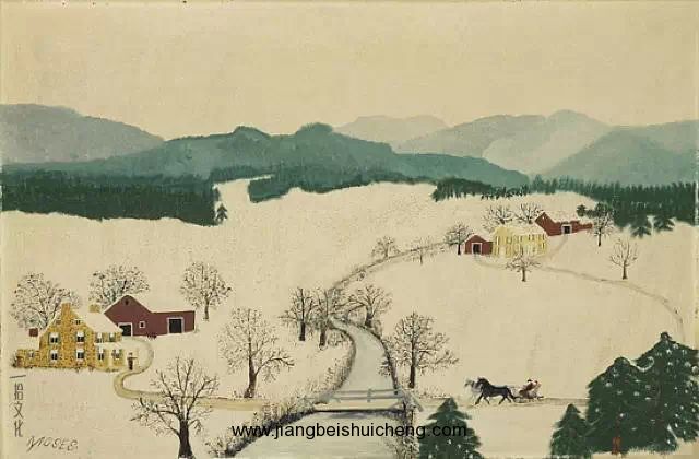 有人問,你為什么在年老時選擇了繪畫,是認為自己在畫畫方面有成功的可能嗎?我的生活圈從未離開過農場,曾是個從未見過大世面的貧窮農夫的女兒、農場工人的妻子。在繪畫前,我以刺繡為主業,后因關節炎不得不放棄刺繡,拿起畫筆開始繪畫。假如我不繪畫的話,興許我會養雞。
