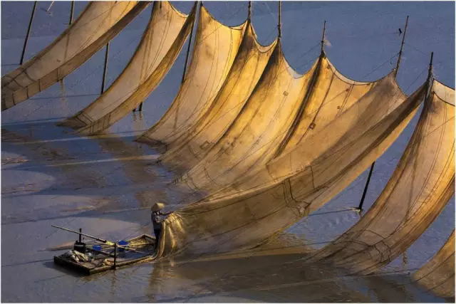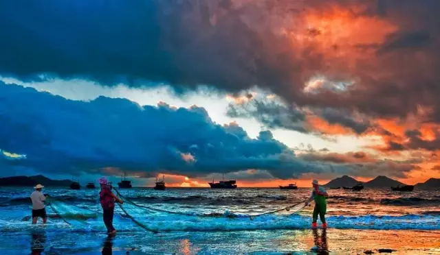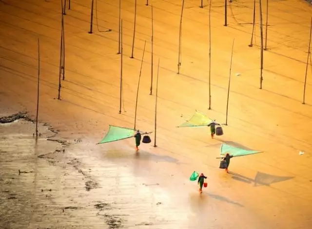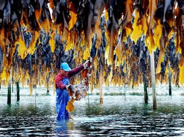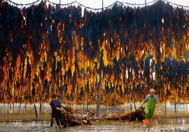 還有曬海帶,適合用中焦進行近景拍攝,這樣能夠體現出曬海帶的過程,和曬海帶的壯觀景象,并可以在日落前運用逆光拍攝,逆光可以表現出海帶的通透質感。