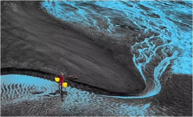 注意觀察灘涂的色塊,霞浦灘涂因為露出水面的時間不同,明暗差別很大,用鏡頭組合好各個色塊,選擇恢宏大氣的大色塊,才能使得畫面簡約優美。