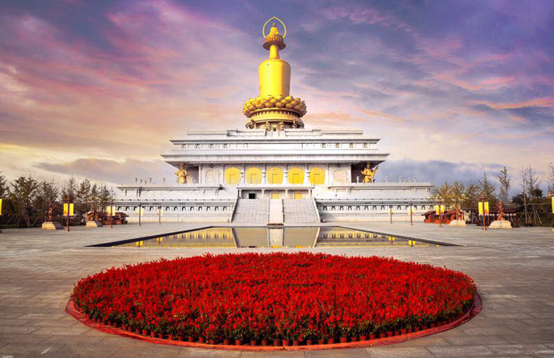 山東省濟寧市兗州區興隆文化園(大興隆寺)景區內,有一座宏偉的靈魂中心建筑——高達118米的靈光寶殿,共分九層。上部金瓶聳然矗立在金蓮花須彌臺上,氣勢雄偉、莊嚴神圣,其中安奉著興隆塔地宮出土的世尊金頂骨真身舍利;下部借鑒了釋迦牟尼壇城的形制,氣勢磅礴象征佛祖的智慧浩瀚無邊與獨特深厚的佛教壇城理念交相輝映。