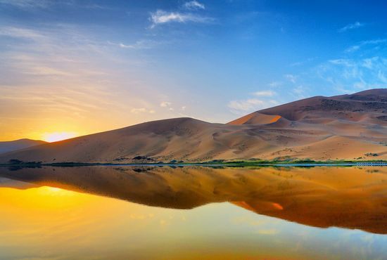 后集合前往【額濟納旗胡楊林核心景區】(游覽約6小時)自由游覽,最為精彩的觀景地為二道橋倒影林和四道橋英雄林。游覽二道橋,最有名的是倒影林,金黃色的胡楊林與黑水河之間形成倒影,一直深受攝影家們的喜愛。充滿原始風貌,有黑水河水道穿過,水道寬闊,兩邊長滿金黃的胡楊樹,間有蒙古包和綿延的沙丘做陪襯,是最佳的攝影的好地方。景區內設有專門的拍攝平臺,以便游客在最佳的位置拍照。游覽四道橋,胡楊林疏密有序,題材多。最有名的是“英雄林”。與二道橋相比四道橋的胡楊更為壯觀,因為它不僅樹干粗壯、枝葉茂盛,而且還有一個特征就是:生與死的胡楊并存,也就更平添了一分壯美。電影《英雄》中兩個紅衣美女在漫天飛葉中決斗的那場戲,就是在這里拍攝的,那炫目的胡楊林絕對蓋的過明星的風采。游覽八道橋沙漠,是我國第三大沙漠巴丹吉林沙漠的北緣部分,是胡楊林與沙漠景觀的結合部。這里是拍攝沙漠日出、日落的絕佳地點,是額濟納政府指定的露營所在地,也是不用深入沙漠就能體驗到沙漠、綠洲風情的地方。游客可以在這里滑沙、騎駱駝,還能看到風格不一的沙雕。在這里能感受到沙漠的粗獷和壯美,日出、日落之時一片金色的沙漠,尤為出彩。也可以自行到額濟納博物館參觀(門票免費,周一閉館)。游覽完畢后乘車赴中蒙邊境——【策克口岸】(車程0.5小時,約20公里),夜游策克口岸,漫步口岸街邊貿易區。