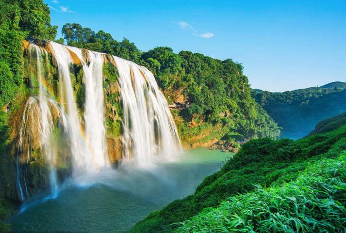 游覽瀑布群最寬的【陡坡塘瀑布】游覽時間:不少于0.5小時;相對大瀑布的雄偉壯闊,她顯得小而精致,因在80版《西游記》中出現而聞名。游覽【黃果樹大瀑布】游覽時間:不少于2小時;(注:景區內扶梯屬不必須消費項目,不含)黃果樹大瀑布寬101米,高77.8米是世界上唯一可以從上、下、前、后、左、右六個方位觀賞的瀑布,通過從瀑布后自然貫通的水簾洞能從洞內外聽、觀、摸瀑布。