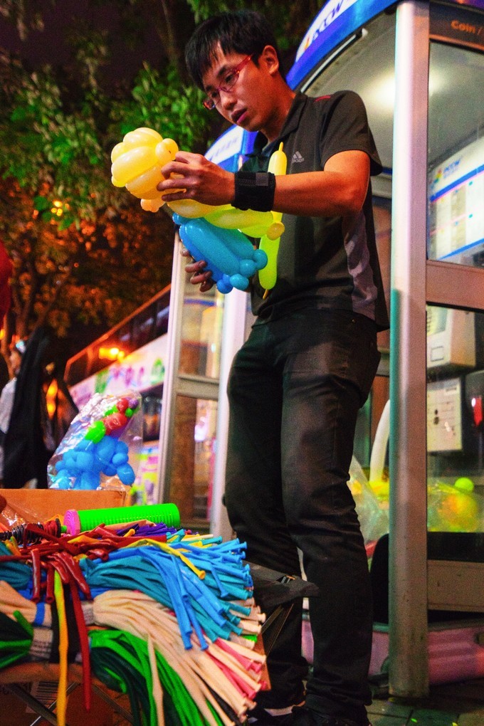 主角登場。這位小哥憑借靈巧的雙手,無與倫比的迅捷,以及來圖即興創(chuàng)作的本領(lǐng)俘獲了無數(shù)膝蓋,當(dāng)然還有花花綠綠的港幣。這是真本事,比旁邊那個不停做重復(fù)扭動狀靠photo me來賺錢的歐吉桑有技術(shù)含量的多。在這“路邊攤”旁,我終于體會了一把好整以暇等待的愜意,而不用和老板一起提心吊膽、張皇四望,時刻準備著為一句“城管來啦”而百米沖刺。