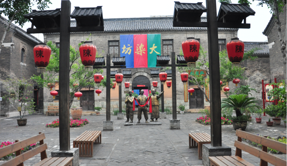 【大染坊】清道光年間東來升綢布莊的舊址,典型的前店后廠的格局,保存完好的建筑迄今已有近200年的歷史,現(xiàn)保存完好的兩進(jìn)院落展示了清末染坊的繁榮盛景。2002年,熱播的電視劇《大染坊》故事的發(fā)生地就在這里。陳壽亭在周村創(chuàng)業(yè)的場(chǎng)景在這里再現(xiàn)。該劇著名編劇陳杰先生為家鄉(xiāng)再度創(chuàng)作并在此拍攝了電視連續(xù)劇《旱碼頭》。陳杰先生英年早逝,陳杰紀(jì)念館坐落于院內(nèi),在這里可以伴隨先生共同聆聽《大染坊》、《旱碼頭》的故事。