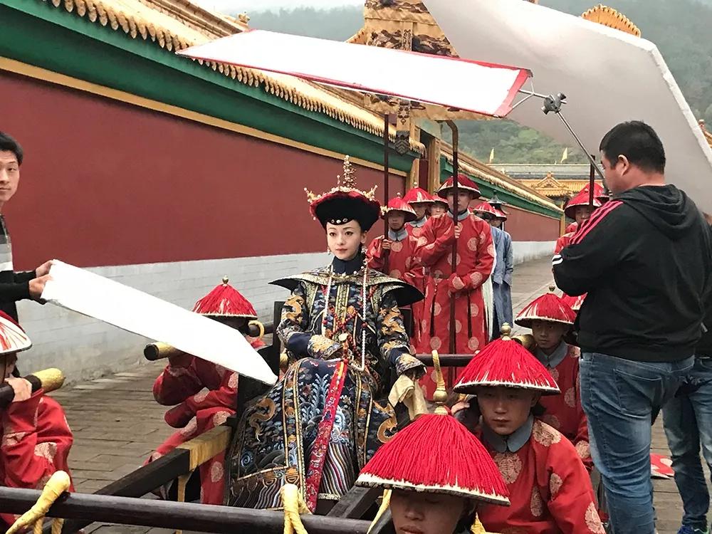 左下方這塊反光板,是用來減小鼻頭下面,眼眶下面,下巴下面的陰影的。上面那塊紅色邊的柔光片,是用來讓天光又能穿過,又能變得柔和你。后邊那塊大型的,是弱弱地給魏瓔珞一個逆光光邊,讓她區別于背景的。