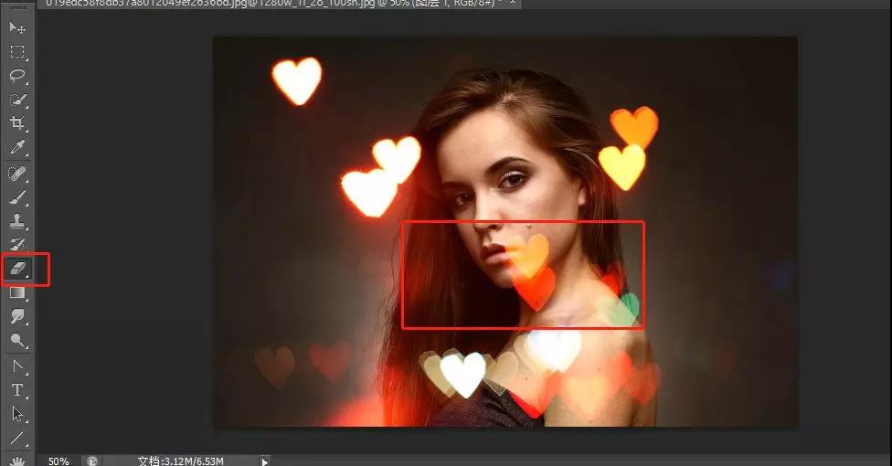 如果出現(xiàn)光斑遮擋到了人像的面部時,可以選中光斑圖片,使用橡皮擦進行擦除。