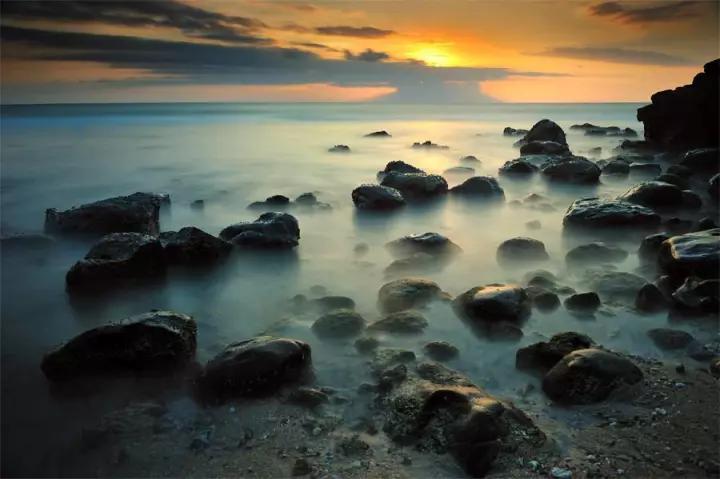 使用慢快門。想要拍出海水運動的動感,可以利用慢門進行拍攝,運動著的海水與靜止的沙灘、石頭形成一個很好的動靜對比效果。