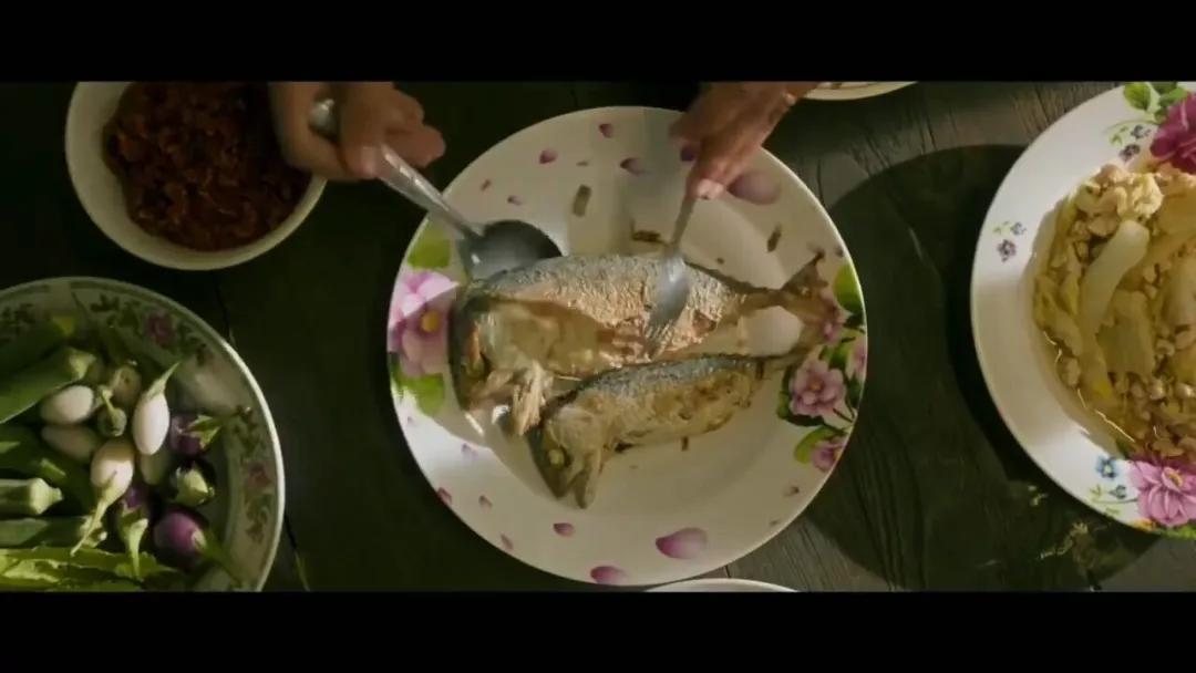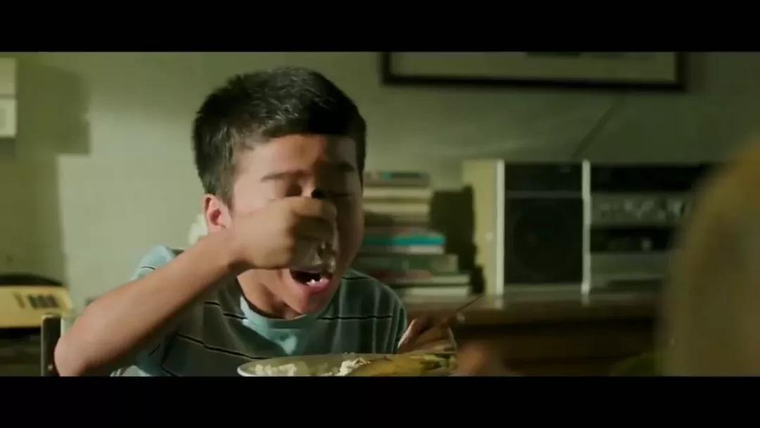 片子的開始母親把餐桌上最好的菜,夾起放進了孩子的碗中,孩子吃得很香。