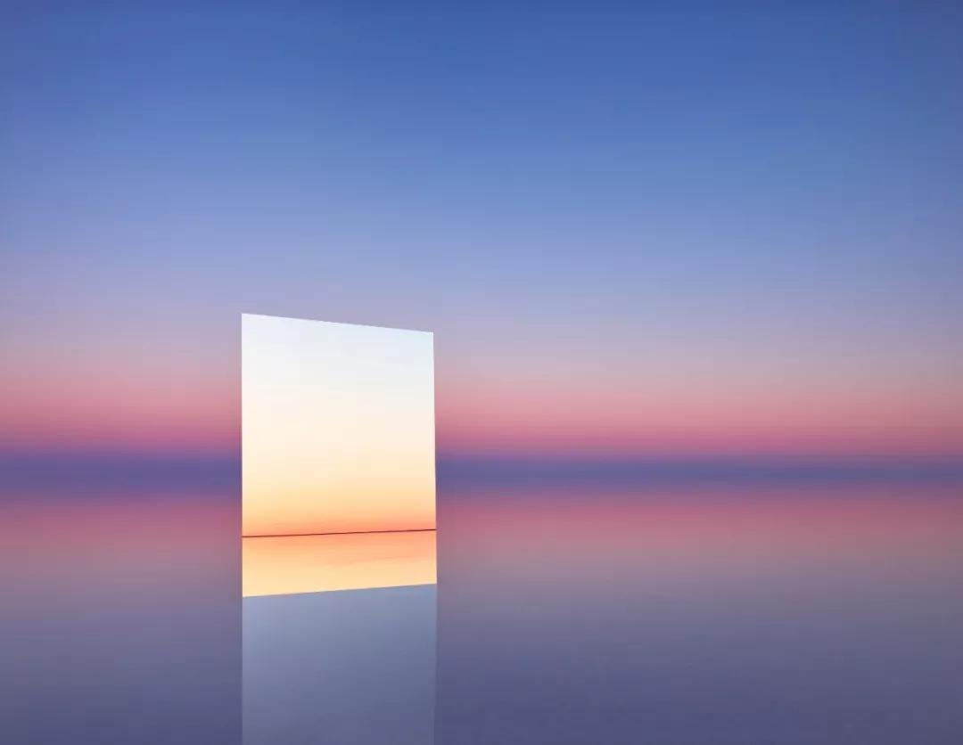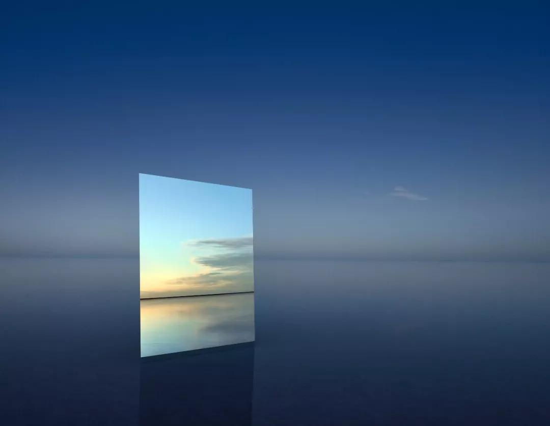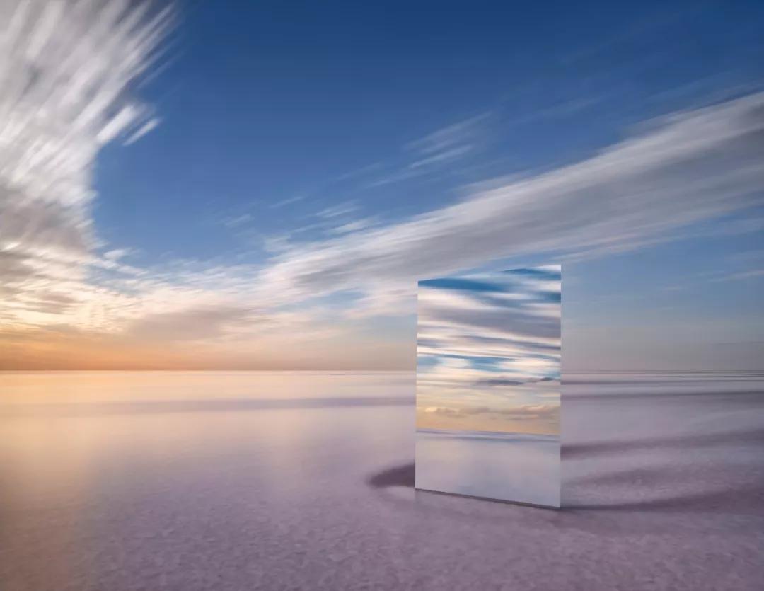 鏡子斜斜地立在湖面,因此能同時捕捉到湖面和天空的景色,周圍環境頗為荒涼,好像是自然環境正在虛榮的“顧鏡自憐”。湖水中的鏡子也將空間割裂的同時統一到了一個畫面里,在這極簡的畫面中,鏡子仿佛通往另一個世界的任意門,也為人們提供了無限的想象空間。