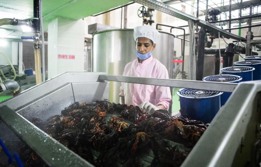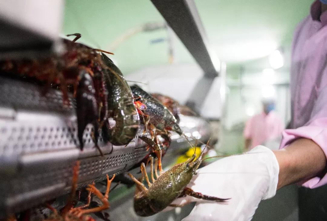 穿過分揀區域,3條集清洗、油炸、烘干、包裝于一體的大型生產線映入眼簾。生產線上,數以萬計的野生小龍蝦經高溫烹制后呈現出十分統一的橙紅色。