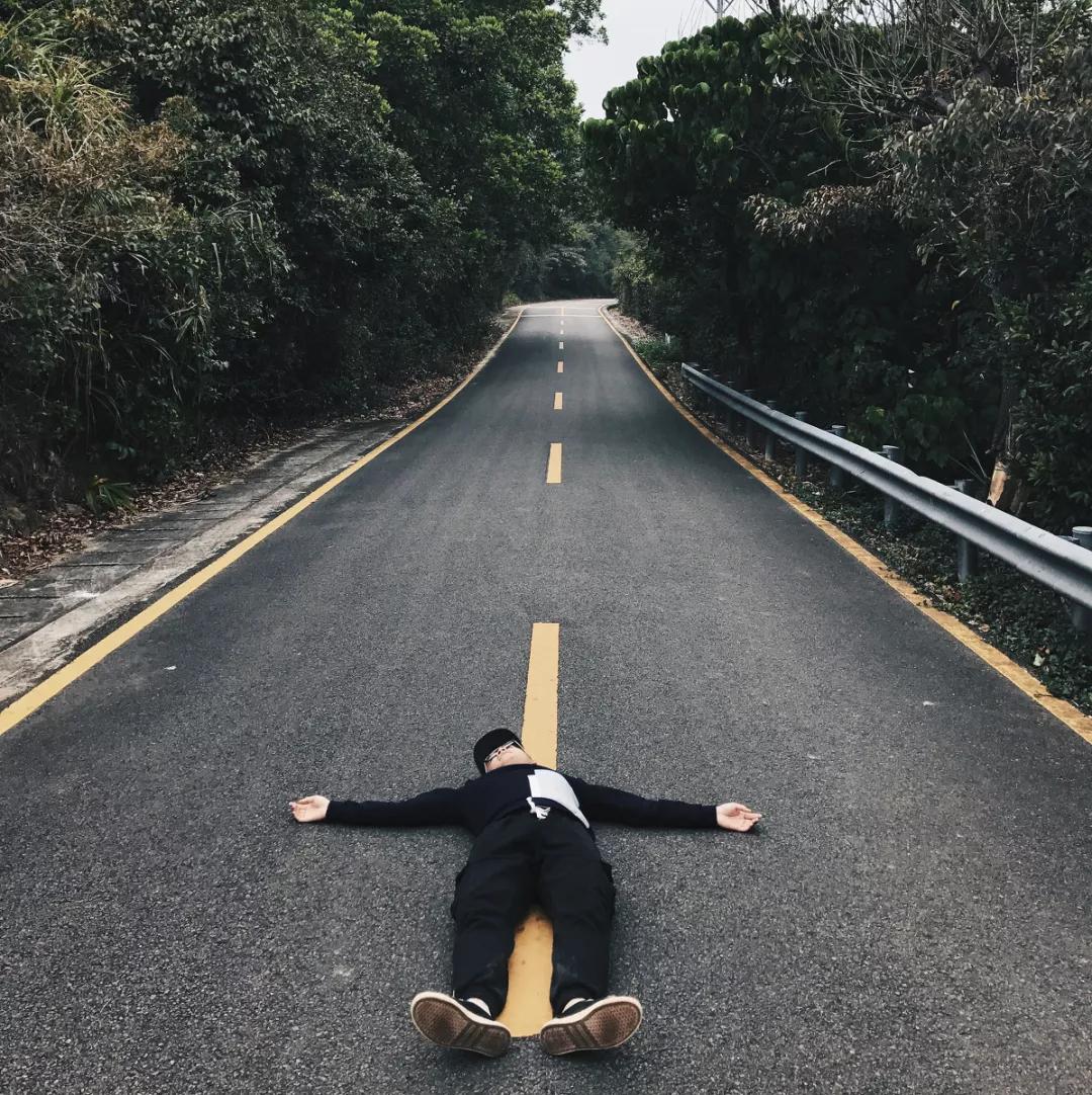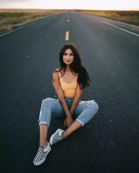 馬路上通常都會(huì)有標(biāo)記的線條,而這就是一個(gè)很好的利用道具。比較簡單的拍照姿勢就是人坐在線上、斜坐在線上,或者是邁開腿站在線上。