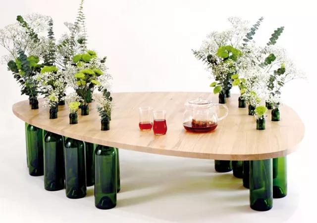 比如這個(gè)矮桌,在模板上鉆幾個(gè)洞,酒瓶作為桌腳,還能在酒瓶上插上花。盤腿坐在花叢之間品啜香茗,實(shí)在美好。