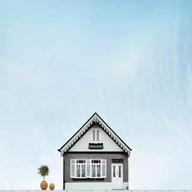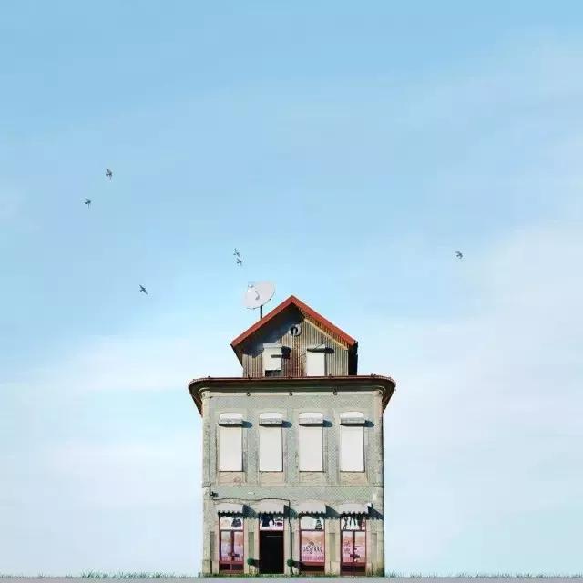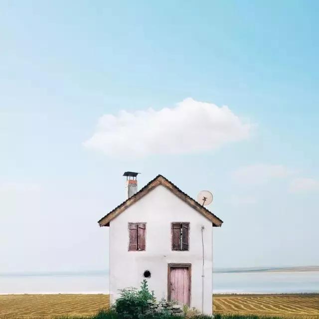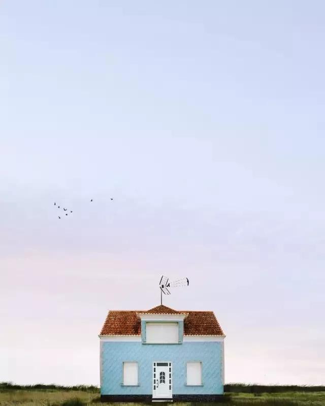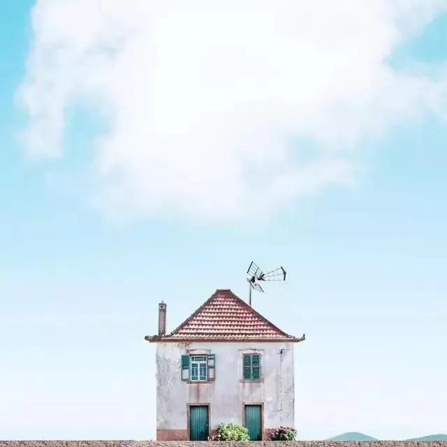 他的拍攝風格統(tǒng)一,偏愛極簡構圖,多以藍天白云為背景,畫面的主角則是一座小房子。