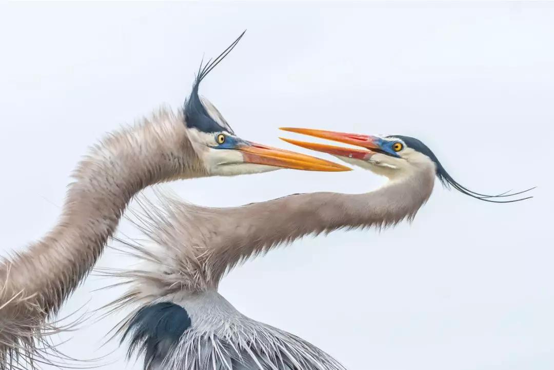 照片背后的故事:“在我抵達我最喜歡的濕地時,一場暴風(fēng)雨在這群大藍鷺中正蓄勢待發(fā)。這個場景一下子抓住了我的注意力:一只雄性大藍鷺,明顯想要引誘雌性大藍鷺,正在雌性面前伸展自己的身體。